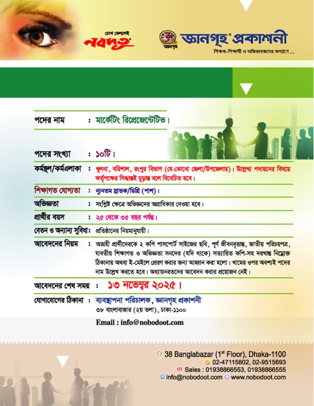 Gyantriha Prokashoni (Nobodoot) Job Circular 2025: Gyantriha Prokashoni (Nobodoot), a renowned publishing house dedicated to serving teachers, students, and parents, has published its 2025 job circular for the post of Marketing Representative. They are recruiting for 10 full-time posts for field-level work in the Khulna, Barishal, and Rangpur divisions. Eligible candidates must have a minimum Bachelor’s degree. This article provides all details, qualifications, and the application process for this Nobodoot sales job.